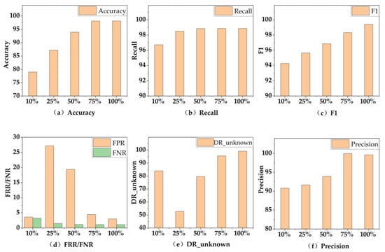 Figure 8 shows seven evaluation metrics of the model we proposed on datasets of different sizes, including 10%, 25%, 50%, 75% and 100%. In Figure 8, we can see that the dataset size of 10% outperforms 25% and 50% on some evaluation metrics. There is a random function in the double-layer DIFF_RF module, which has a random effect on the experimental results. When the size of the datasets is too tiny, this random phenomenon will be more obvious. However, with the increase in the size of the datasets, although this random phenomenon also exists, it will have less of an impact on the experimental results. This resembles a coin toss experiment—maybe the distribution of the results of ten experiments will be uneven, but with the increase in the number of experiments, the distribution of experimental results will stabilize to 50%.