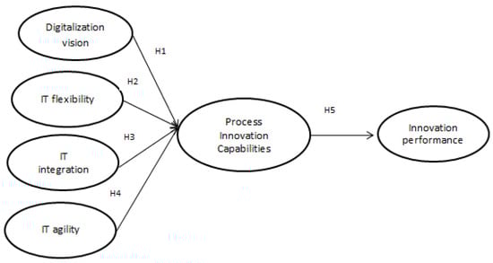 Previous research by Leonhardt et al. (2017) [46] argued that IT agility, which includes IT sensing and IT responding, positively affects IT functions’ digitalization support for digital innovation and strategic decision making. IT agility seems to have helped businesses find new market opportunities and respond quickly to them. Several surveys have shown that IT agility helps organizations improve continuously [46]. These improvements could influence the development of new processes, new products, or better services. In line with previous research, this paper argued that IT agility has a significant effect on how well organizations can innovate their processes, which in turn has an effect on how well organizations innovate.