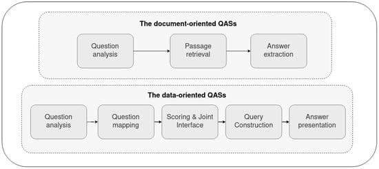 QASs can be viewed as an extension of search engines in the sense that they target finding precise answers to natural language questions, rather than returning a ranked list of relevant sources []. Since in natural language, the same meaning can be expressed in different ways and the same phrase having different meanings, QASs need to address lexical gap and ambiguity, respectively [,]. For example, the vocabulary used in a question can be different from the one used in the underlying knowledge source. The first QASs were introduced in the late 1960s and early 1970s to access data over databases [,,]. With academic research, QASs have become a crucial topic and attracted massive attention over unstructured and structured data such as text documents and RDF knowledge graphs. Thanks to the development of the semantic web, a large amount of structured data has become available on the web, and the demand for QASs increases day by day [].