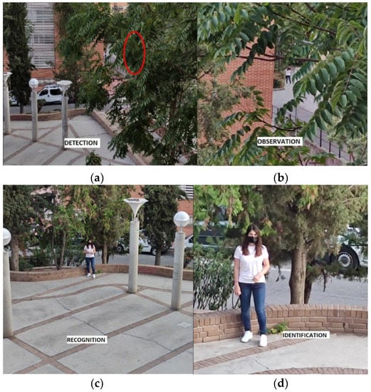 Finally, identification (Figure 2d) is the ability to see enough characteristic elements in the image to make the asset recognisable on subsequent occasions. In the previous example, it is possible to observe enough of the person’s features to give an unambiguous picture of him or her (as in the images). These last two capabilities, recognition and identification, are the main objectives pursued by a video surveillance system. In fact, the vast majority of research lines have focused on developing these capabilities, exploiting the increment in the resolution of the sensors. The higher the resolution, the sharper the image, and the greater the distance at which that recognition and identification can be conducted.