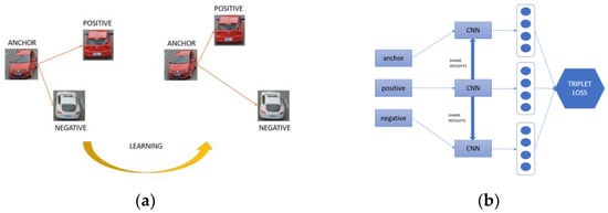 As mentioned in the previous section, the second part of this surveillance system will also focus on the visual characteristics of the whole car. In the introduction, we define object re-identification (Object ReID) as the ability to recognise a specific object that has previously been identified, or “the efforts to associate a particular object through different observations” []. This term has been widely used for people, as the possibility “to associate people across camera views at different locations and times” []. In fact, re-identification has traditionally been used in faces rather than cars. Facenet [], launched in 2015, is a good example. Right after it was developed, many companies started to offer facial recognition security solutions, such as passport identification. Although vehicles have many more characteristic patterns than faces, the re-identification of vehicles is more difficult than that of people []. That is why even though we can find traditional methods as well as deep learning ones, deep learning development has led to a massive use in Object ReID, displacing traditional methods. It can be considered to be more efficient, because these methods do not focus only on the specific details of the cars, but also on the whole image, selecting several features in the same process [,]. That being said, in this section, we are going to describe the most important deep learning procedures for vehicle re-identification.