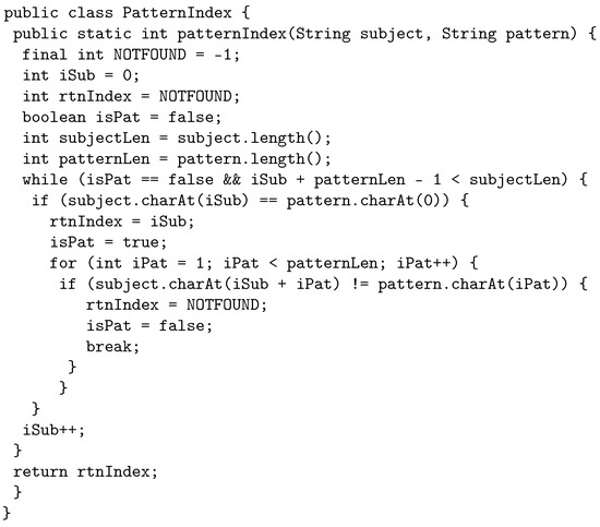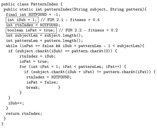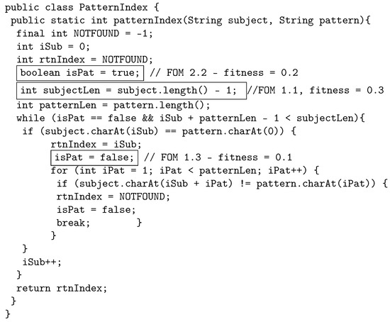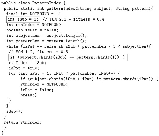 The following example illustrates how the proposed crossover works by using java source code. The original program, called PatternIndex (https://cs.gmu.edu/~offutt/softwaretest/java/PatternIndex.java accessed on 1 May 2022). and shown in Figure 2, searches for a given pattern in a given string and returns the beginning index of that pattern. In Figure 3, we show the first parent selected for crossover. The first parent is a third-order mutant, built from FOM 1.1 with fitness 0.3, FOM 1.2 with fitness 0.5, and FOM 1.3, with fitness 0.1. The FOMs are shown in a box in the code with a comment that displays the mutant name and fitness. Similarly, Figure 4 shows the other parent selected for crossover, which is a second-order mutant built from FOM 2.1 with fitness value of 0.4, and FOM 2.2 with fitness value of 0.2.