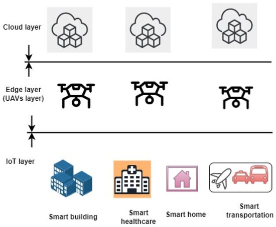 The bottom layer comprises IoT systems that manage ongoing tasks created by the IoT systems’ changing sizes. The IoT systems transmit QoS requests and task characteristics, such as the size of the task and the time limit, to the UAVs. In addition, the restricted potential computation power and short operating period of the IoT systems result in the tasks being offloaded to the UAVs to minimize energy consumption and computational time.
