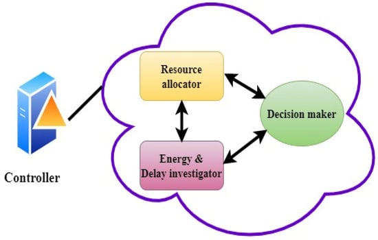 The drone-edge and cloud layers send the controller VM data, for example, computation capabilities and power consumption. The controller utilizes the information non-task and the VM data to allocate the task to a suitable VM. Every controller in an IoT system gathers information via its insurance region and operates through drone or cloud layers. After obtaining the task, the controller takes the subsequent steps: the task will be rejected if the delay for the task outcomes does not satisfy the time conditions; otherwise, the controller transmits the task to the appropriate preference queue according to its preference layer; i.e., the deadline. For each task, the controller checks whether the accessible resources at the edge level are adequate to perform the task or otherwise checks other preference queues. The task is accomplished if the requirement is satisfied, considering the delays and consumed power for the corresponding VM. If not, the task is transmitted to the cloud level for implementation.