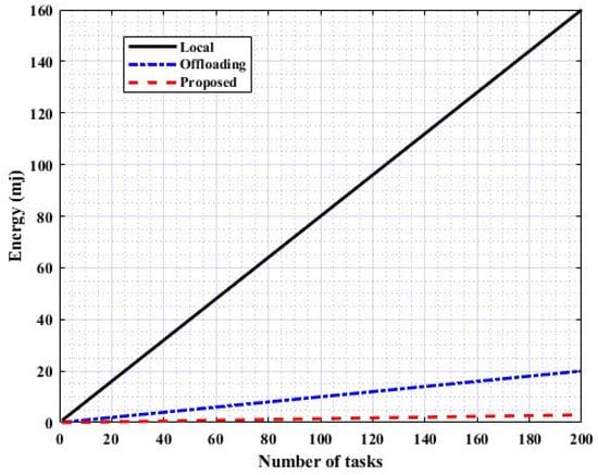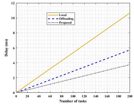 Figure 3 displays the typical computational delays when the tasks were increased. It can be observed in Figure 3 that the delays also increased as the number of tasks increased. The delay in the local case was more significant than for the edge (UAV offloading) case and the suggested auction-enabled approach. The device’s processing power was weak, so it was not easy to process many tasks.
