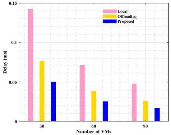 Figure 5 and Figure 6 show the operating system for the case with VMs at the edge level. At this point, the number of tasks was fixed at 80. The typical delay relating to the multiple criteria optimization issue is demonstrated in Figure 5.