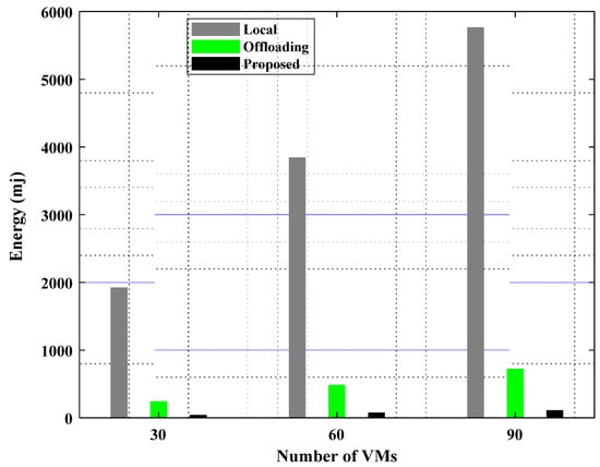 Figure 4 shows that the consumed energy increased with the number of tasks. The device had to consume a lot of energy to perform the tasks. The number of tasks increased the VM’s operation time, thus increasing the consumed energy. Moreover, the VMs’ timeout also entailed energy utilization. The proposed method consumed less energy in comparison to the other algorithms. Choosing a VM by relying on the target (or bid) value and reward value worked well in the auctionable approach.