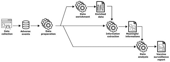 In general, surveillance systems are based on two main approaches: passive surveillance and active surveillance. The first approach occurs when laboratories, physicians, or other healthcare providers regularly report cases or diseases to the local health department. Passive systems are most widely used to collect adverse events following immunization (AEFI) (an AEFI is any adverse medical event that follows immunization and is not necessarily causally related to vaccine use []. The adverse event may be any unfavorable or unintended sign, abnormal laboratory finding, symptom, or disease), and the system depends on receiving reports of adverse events, so data quality and completeness are difficult to ensure. An example of a passive surveillance system is the Vaccine Adverse Events Reporting System (VAERS) [], which relies on information about unusual or unexpected events after vaccination from those who choose to voluntarily report their experience. The second approach provides accurate and timely information, since designated staff visit healthcare facilities, communicate with healthcare providers, and detect possible cases of adverse events of particular interest (AESI) (an AESI is a pre-specified medically significant event that can be causally associated with a vaccine product and must be carefully monitored and confirmed by further special studies. For example, AESIs associated with the administration of COVID-19 vaccines [] cover all body systems, including immunological, cardiovascular, neurological, musculoskeletal, and dermatological manifestations) and review patient records; however, this is more resource and time-consuming than passive surveillance. An example of an active surveillance system is the Therapeutic Goods Administration system (TGA) [], which exploits SMS messaging to directly ask people if they have experienced potential side effects.