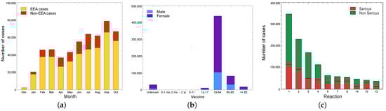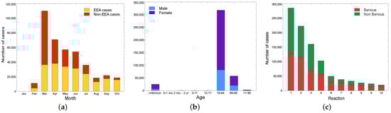 However, the severity of these events on a scale of 1 (very low) to 5 (very high), is low with a value of 2.39 on average, a maximum value of 2.65 for lethargy, and a minimum value of 2.09 for the other adverse events collected, as shown in Figure 9b. Regardless of dose number, the distribution of suspected adverse events is in line with that reported in previous sections, as shown in Figure 10a,b. In fact, the charts reveal that the number of reports is highest in the 20–49 age groups, and about 61% of them involve women.