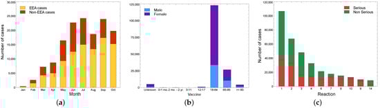 Considering the “Other” category, Figure 10c shows the keywords most commonly used by platform users to describe the reactions that were observed after administration of the vaccine. Specifically, 104 reports fell within the category for joint and muscle pain (back, neck), followed by 48 for injection site warmth, erythema, and pruritus, 44 for lymphadenopathy, 33 for menstrual cycle alteration, 28 for arrhythmia, tachycardia, and chest pain, 23 for chills, 18 for drowsiness, 12 for transient hypertension and dizziness, 8 for eye disorders (i.e., blurred vision and hemorrhage), 7 for paresthesia, and 6 for tinnitus. Regarding the severity of such events, 21.22% (83/391) were classified as “high”, 12.28% (48/391) as “medium”, and 66.5% (260/391) as “low”.