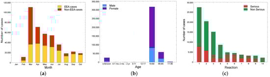 The number of cases is higher in the age groups between 18 and 64 years (about 75%), and 72% of reports concern women and 27% men (sex is not reported in 1% of the reports, Figure 2b). Most notifications are classified as non-serious (about 61%) and fall within general disorders and administration site conditions (25%), followed by nervous system disorders (17%), musculoskeletal and connective tissue disorders (12%) and gastrointestinal disorders (8%), as described in Figure 2c, which shows the ten main adverse events, each represented by a unique identifier (see Table 1) and divided by seriousness (an event is considered serious if it resulted in hospitalization, death, or other clinically significant conditions. In addition, some adverse events are labeled as serious if recognized by international health authorities, regardless of the clinical consequences. Based on these considerations, a fever of ≥38 °C that requires the administration of a medicine can also be considered serious).