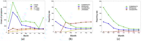 Distribution of reports by onset time of symptoms from vaccination date (a), by 1st dose (b), and by 2nd dose (c).