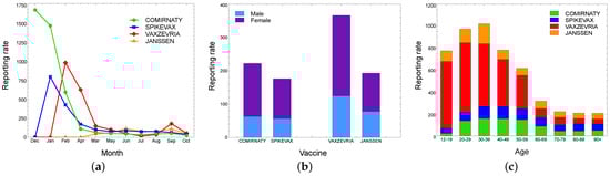 Specifically, Figure 7a shows the distribution of reports by date of onset of the suspected adverse reaction, depending on the doses of vaccine administered and without considering the number of doses, whereas Figure 7b,c show the reporting rate by sex and age, respectively. The plots reveal some interesting features. First, it is evident that the number of suspected adverse reactions decreases over the time period, showing that an increase in doses administered does not correspond to an increase in adverse reactions. Second, the female sex reported more suspected adverse reactions than the male sex, particularly with regard to the Vaxzevria vaccine. Third, the notification rate is higher in the 12–59 years age groups and decreases in older age groups. From the plot, we see that the occurrence of suspected adverse reactions typically increases for the Vaxzevria vaccine in the age group 20–29.