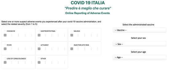 To make our evaluation more accurate and complete, we designed and developed an independent platform for collecting and analyzing spontaneous reports, where everyone (from health professionals to patients to citizens) can report a suspected adverse event through a secure online submission process [], as shown in Figure 8. The form has required data fields for patient demographic information (sex and age), vaccine administered, and severity outcome of the adverse event on a scale of 1 to 5 (the severity of an event varies between 1 and 5, broken down as follows: low (“1”, “2”), medium (“3”), high (“4”, “5”)), including the description of an adverse event if the "Other" option is clicked.