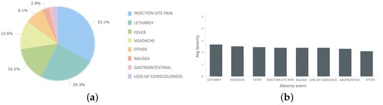 Starting from the scientific divulgation page of one of the authors [] with more than 10,000 followers, we collected about 2000 spontaneous and anonymous (GDPR-compliant) reports (third dose pre-booster) from 1 October 2021 to 20 November 2021, distributed as follows (see Figure 9a): 33.1% of reports referred to injection site pain, 24.3% to lethargy, 15.2% to fever, 12.6% to headache, 8.1% to other (i.e., more detailed reporting that does not fall into a predefined category, such as menstrual cycle alteration, arrhythmia, tachycardia, chest pain, etc.), 2.9% to nausea, and 2.0% to gastrointestinal disorders and loss of consciousness.