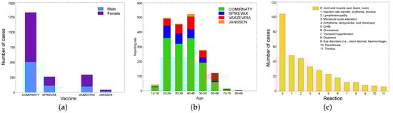 Singh Amninder et al. [] used VAERS data from 1 January 2021 to 30 April 2021 to analyze the adverse effects of the three COVID-19 vaccines authorized in the United States (US), i.e., Pfizer/BioNTech, Moderna, and Janssen. With respect to our work, this is less general, as it is specialized, providing information on the effects of vaccines in the United States only, over a limited period of time.