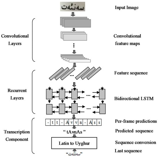 For text recognition, traditional methods usually process individual characters first and then integrate them into words by beam search, dynamic programming, etc. []. The recent methods cast the text recognition task as a sequence recognition problem. Most of the methods are used to recognize majority languages, such as English and Chinese [,]. In order to recognize Uyghur text in images with a simple background, in this paper the Convolutional Recurrent Neural Network (CRNN) was improved, and then carried on the text sequence recognition with the improvement of the CRNN model to the Uygur texts in images. In this paper, the Uyghur texts in images were labeled in Latin, and then the decoding results of the transcription layer were converted into Latin characters. The Latin characters were converted into Uyghur text sequences finally.