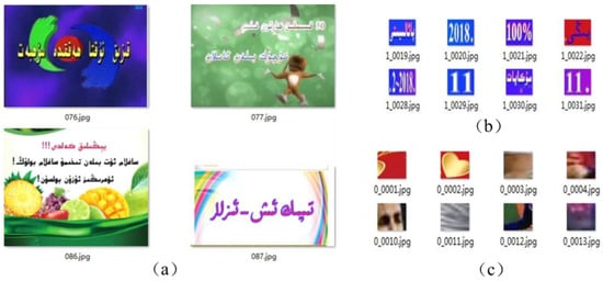 We collected each type of text in the natural scene image and classified it, reorganized and divided it, resulting in the text detection data set, which contains 386 color images, as shown in Figure 5a. The training set consists of 266 randomly selected text in the natural scene images, which are used to construct a cropped regions dataset for training and testing the CNN classification model. The cropped regions dataset contains 16,683 cropped regions that are cropped from text in the natural scene images, with the positive samples consisting of 8485 cropped text regions (examples shown in Figure 5b) and the negative samples consisting of 8398 cropped text regions (examples shown in Figure 5c. The testing set consists of 120 randomly selected text in the natural scene images, which are used to evaluate the whole text detection method.