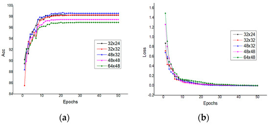 The performance of the CNN classification model can affect the result of the detection method directly, if the classifier could prune as many non-text regions as possible, the precision of the system would be higher. But in order to train the CNN classification model effectively, the input images are resized into the same size. However, if the size is set too large or too small, it always loses text information. So in the experiment, the size of the region samples is resized to , , , and (). And the accuracy and loss of the CNN classification model with different sizes of the region samples are different. The details of the change are shown in Figure 8. As illustrated in Figure 7, the average loss of the CNN classification model is almost same in different size, but the CNN classification model has the highest accuracy value when the regions are set to .