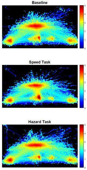Heatmap of gaze points for the three videos aggregated for the Baseline Task (top), Speed Task (middle), and Hazard Task (bottom). The heatmap was divided into 10 × 10-pixel squares and normalized. The colors are on a base-10 logarithmic scale. For example, a dark red color (value = 5) means there was 100 times more attention to that region than a yellow color (value = 3).