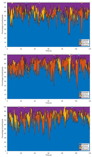 Figure 3 shows the attention distribution across the four AOIs for Videos 1, 2, and 3 in the Baseline condition, i.e., without a secondary task. It is noticeable that the attention distribution strongly fluctuated with elapsed time. In an attempt to elucidate the causes of these fluctuations, Figure 4, Figure 5, Figure 6 and Figure 7 show the moments in Video 3 when a maximal proportion of participants focused their attention on the windshield (t = 94.1 s), left mirror (t = 24.8 s), right mirror (t = 84.0 s), and dashboard (t = 17.0 s), respectively.