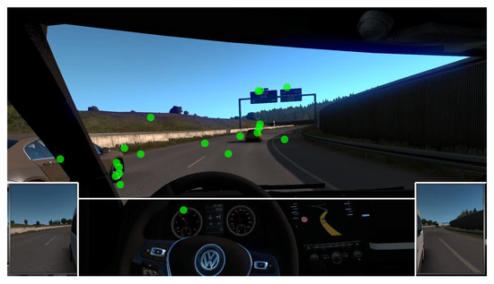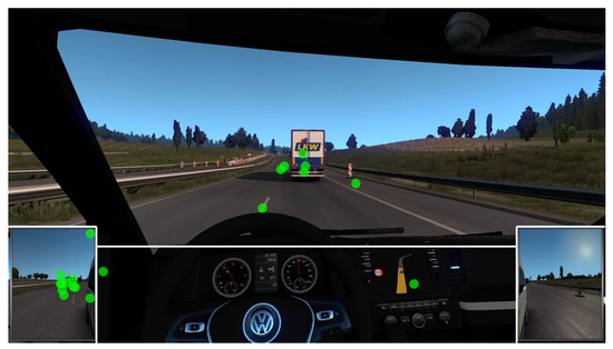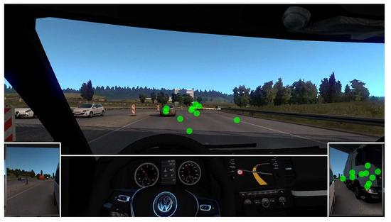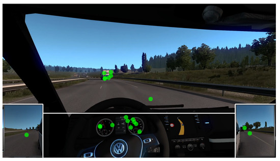 Moment in Video 3 where most participants attended to the right mirror (Baseline Task). The green markers represent the gaze coordinates of individual participants. White lines are drawn around the AOIs.