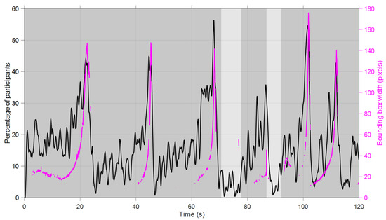 Left axis (black): Percentage of participants with their eyes on the left mirror (Video 2; three tasks averaged). Right axis (magenta): Width of the bounding box of the detected vehicle in the left mirror. The shaded background indicates whether the ego-vehicle was driving on the right lane (dark gray) or left lane (light gray).