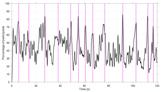 Percentage of participants with their eyes on the dashboard (Video 2, Speed Task). The dotted vertical lines represent the moments of 100 km/h threshold crossings.