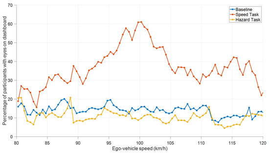 The present study also revealed indications of task prioritization. For example, participants were more inclined to look at less critical elements such as the speedometer when no hazards were present in the vicinity. In the Speed Task, participants looked at the speedometer considerably more often than in the Baseline task, but still in a functional manner—that is, attention seemed to be focused on the speedometer when there was a high probability that the threshold speed would be exceeded. This latter finding is in line with Senders’s [55] notion of conditional sampling and with Eisma et al. [56], who observed similar results when participants had to detect threshold crossings while watching an instrument panel of moving dials.