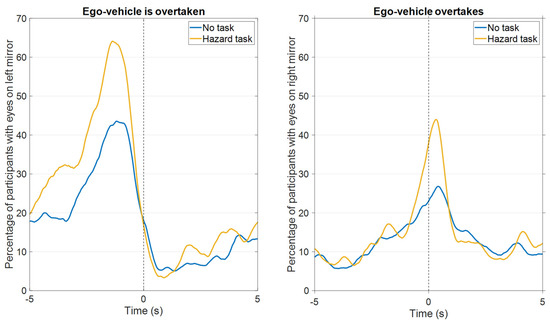 Percentage of participants with their eyes on the left mirror when another vehicle overtook the ego-vehicle in the left lane (left panel) and with their eyes on the right mirror when the ego-vehicle overtook another vehicle in the right lane (right panel) (Videos 1–3 combined, 8 and 15 overtakes, respectively). The vertical line at t = 0 s represents the first moment when part of the overtaking car became visible in the left side window (left panel) or the last moment when part of the overtaken car was visible in the front window (right panel).