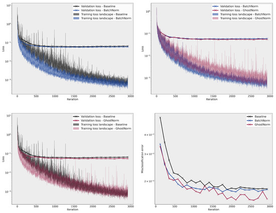 Comparison of the loss landscape on MNIST between the baseline, BatchNorm, and GhostNorm with different values. The last figure (bottom right) depicts the misclassification error on the testing set during training.