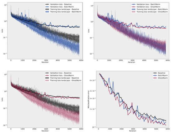 Comparison of the loss landscape on CIFAR–10 between BatchNorm and GhostNorm with different values. The last figure (bottom right) depicts the misclassification error on the testing set during training.