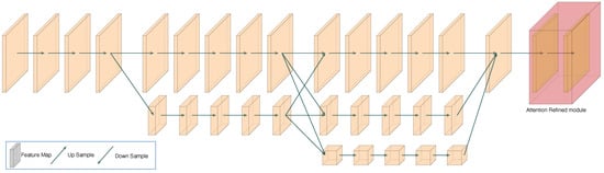 In the feature fusion unit (shown in Figure 2), there are three situations for information fusion: Firstly, the resolution of the input feature map is the same as that of the output feature map. Direct replication is adopted in the network without any operation, which also ensures that the whole resolution branch has a gradient transmission path. Secondly, the resolution of the input feature map is higher than that of the output feature map. The convolution with stride 2 is used as the down-sampling operation in the network, which can reduce the information loss caused by a decline in spatial resolution to a certain extent. Thirdly, the resolution of the input feature map is lower than that of the output feature map. A convolution is used to align the number of channels in the network, and then the nearest neighbor interpolation method is used for up-sampling.
