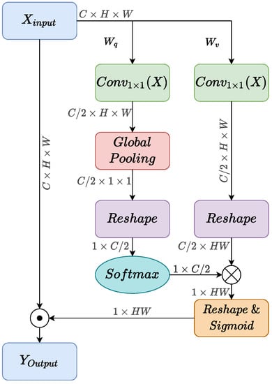 The procedure is shown in Algorithm 1 and the structure is shown in Figure 3. Firstly, the input is processed by two standard convolutions, achieving and , respectively. Then, the Global Pooling operation is used for to obtain global information and transfer the dimension into . Meanwhile, only needs a simple reshaping operation and outer-product between and , which is processed by , obtaining a . Then, the is handled by and in sequence to obtain a new . Finally, there is an inner-product operation between and the input X.