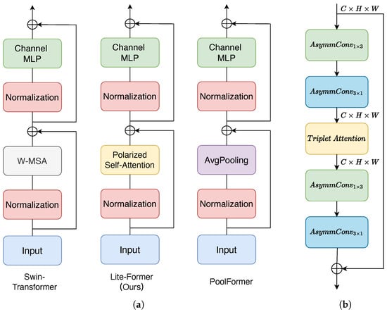 Illusion of the basic block. (a) The left most one illustrates the block structure of the Swin Transformer, the middle one is that of ours, and the right most one is that of PoolFormer. (b) Demonstration of the attention-refined block.