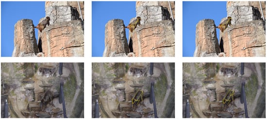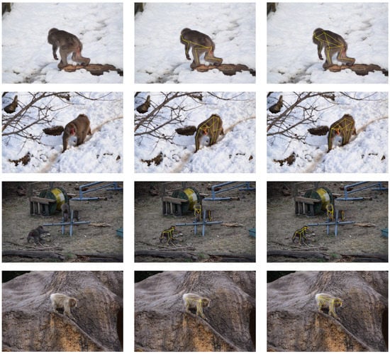 The annotation results of HR-MPE in the test set are shown in Figure 6. The first column is the collected original image, the second column is the manually annotated pose information, and the third column is the pose information estimated by the model. The model can accurately predict the pose of macaques, whether it is multiple monkeys or a single monkey. Some occluded parts in the training set are annotated, as described in Section 3.1. The model can effectively learn these features. It is worth noting that certain keypoints in the test set that are not manually annotated are also correctly predicted. Because of body occlusion, the right forelimb of the monkey in the first row, for instance, can not be marked. However, the model can still approximate its location, proving the model’s capacity to be generalized.