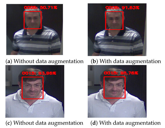 Figure 7 shows that the face from the LFW dataset [7] is recognized with 72.32% accuracy. However, the confidence is higher with data augmentation based on the combination of DCGAN and basic transformations, achieving 77.08%. In Figure 8a, we can see that the face prediction has only 50.71% confidence when using the ChokePoint dataset [9]; however, this confidence is higher when applying data augmentation with DCGAN and basic manipulations, achieving 91.63%, as shown in Figure 8b. The same is the case in Figure 8c,d with an increase of 1.8% when adding more samples per class. The results with the LFW database [7], VGG database [8], and ChokePoint database [9] show that the proposed approach can improve face recognition performance and lead to better recognition results.