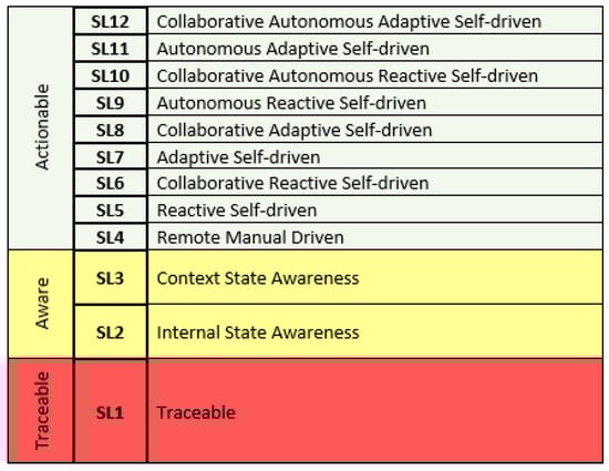 The defined categories specified in Table 2 (SLx) represent the different smartness levels and were identified from an evolutionary vision organized according to the traceability, awareness and actionability general capabilities. For instance, according to Figure 1, an artifact considered smart at the lowest level must include some form of identification so it is possible for it to be directly or indirectly traceable. This is the only mandatory criteria in Table 2, and it is supported by the smart fridge example described in Section 3.2. In the next capability set are the devices that are able to know their internal and external states. In the third capability set are the devices that have the ability to act by being remotely manually driven, self-driven under a user’s supervision or fully autonomously driven with learning, adaptability and collaborative strengths. All the extracted inner capabilities from these three ordered capability sets (Figure 1) define the ordered smartness categories that make part of the proposed typology (Table 2).