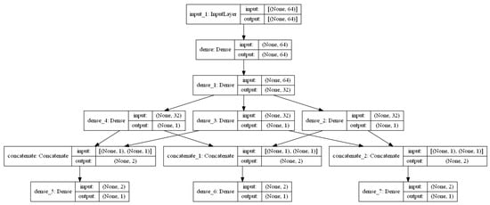 In this study, a neural network with 64 input layers and two hidden layers with 114 and 45 units, were used, respectively, based on Bayesian Optimization hyperparameter tuning. Single-output models have different number of nodes and parameters again based on hyperparameter tuning. For single output models, only one output node is added to predict the output variable. On the other hand, for multi-output models, to capture the relationship among the three output variables, three output nodes were first predicted and then the concatenated weights of each of the two output node pair was sent to the third output. The model’s architecture is shown in Figure 2.