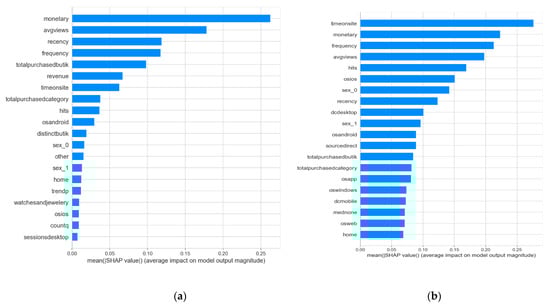 Feature importance levels defined by average SHAP values trend in amount spent (TAS) (a) Multi-output model TAS SHAP values, (b) single-output model DPC TAS values.