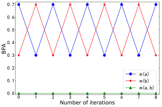 Table 1 shows the BPA and entropy after Yin’s negation iterations, and Figure 1 visualizes them. When the BPA only contained two focal elements, the negation was reversible: . No matter the number of negation iterations, the belief values of and always cyclically changed between 0.7 and 0.3. This did not converge into a certain value. Correspondingly, entropy no longer increased and could not reach its maximum.