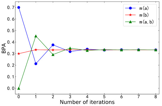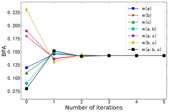 Table 3 shows the BPA and entropy after logarithmic negation iterations, and Figure 3 visualizes them. The belief distribution gradually converged as the number of iterations increased. Lastly, the BPA converged into uniform distribution. At the same time, maximal entropy was obtained. We can understand this phenomenon in terms of information consumption. In fact, each iteration of negation is a process of consuming information. The consumption of information means an increase in entropy. When maximal entropy was reached, there was no more information to consume for the BPA, and entropy stopped increasing. Theorems 3 and 5 of logarithmic negation were verified again.