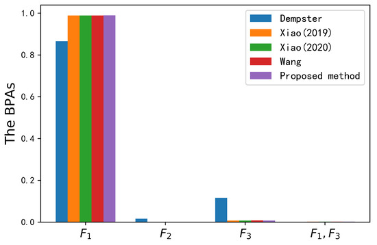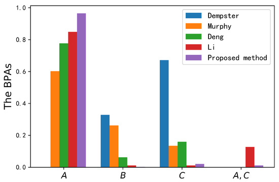 Evidence is highly conflicted with other pieces of evidence. As shown in Table 6 and Figure 4, Dempster’s method did not identify the correct target A. The operation of a one-vote vet produced a counterintuitive result that the belief value of target A is always 0. However, other methods all overcame the impact of conflicting evidence and obtained reasonable decision-making results. The experimental results show that the belief value of the correct target A for the three other methods was 0.6027, 0.7773 and 0.8491. The degree of belief was relatively low. The proposed data fusion method could achieve better performance in combining pieces of conflicting evidence, as it had the highest belief value (0.9653) for the correct target A. Compared with the three other methods, the belief value of the correct target was improved by 36.26%, 17.8% and 11.62%. The main reason is that the logarithmic negation could extract more useful information in the process of conflict processing from the perspective of geometric negation. The accuracy of the fusion results was improved, and the target type could be identified more accurately. Furthermore, since the entropy of conflicting evidence is usually low, it can distinguish between conflicting and normal evidence with Deng entropy. The entropy difference between the conflicting evidence and its negation was larger than that of normal evidence. Therefore, the proposed method assigned a lower credibility value to the conflicting evidence, and more reasonable results were obtained. This application proves the validity of the proposed method.