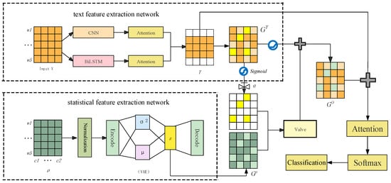 Our model mainly consists of four parts: statistical feature extraction, textual feature extraction, feature adaptive fusion, and classification. We show the overall model structure in Figure 1.