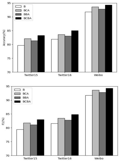 The proposed model outperformed all baseline models in performance. Regarding the Twitter15 and Twitter16 datasets [], compared with the best-performing PPC, the accuracy increased by 3.3% and 2.3%, respectively; the F1 value increased by 5% and 3.5%, respectively. On the Weibo dataset, compared with the best-performing BDCoNN, the accuracy and F1 value improved by 0.1%, respectively. These results confirmed the effectiveness of fusing statistical information with adaptive valves.