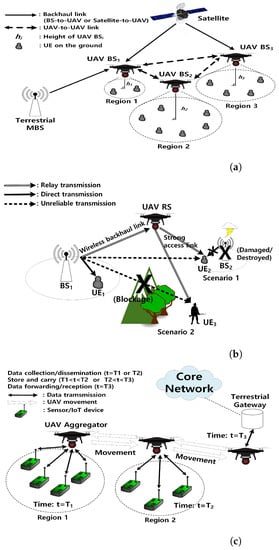 UAV RS provides a wireless connectivity to isolated users or user groups, who do not have a direct communication link from a BS or a transmitter, without sacrificing the performance of networks, thereby enhancing the capacity of the overall networks [44]. The UAV relay network (URN) can be constructed with single or multiple UAVs, but the number of UAVs, the topology and the routing protocol for a reliable relay communication, and an efficient power consumption should be optimized for applications [43,44]. URN is suitable for military communications or emergency responses where the temporary communications between command center and operators are essential. The outage probability of access links should be considered to provide a reliable relay connectivity to mission critical operators [43,44].