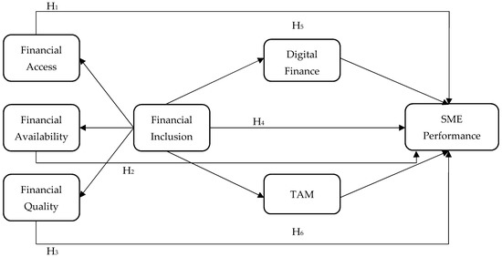 The next category is the quality of usage, which measures how clients use financial services and the standard of the services. The frequency and duration of the service use over time, such as the average savings balances, the number of transactions per account, or the number of electronic payments made, might be considered as the quality of financial products and services [42]. According to Sarma [19], the number of bank branches and ATMs per 10,000 people has been used to gauge accessibility at an individual level. The quality of the financial services depends on accessibility and availability. The present study has focused on two types of financial services: deposits or transactional accounts of SMEs. According to Ombi et al. [43], financial services’ affordability positively impacts SMEs’ performance. Correspondingly, not only affordability but also improvement of availability of financial services in a country, under the dimension of financial inclusion, has a relationship with the performance expansion of firms [44,45]. Based on the evidence of a strong link presented earlier between financial inclusion and SME performance through access, availability and quality, the following hypotheses were planned for this study:
