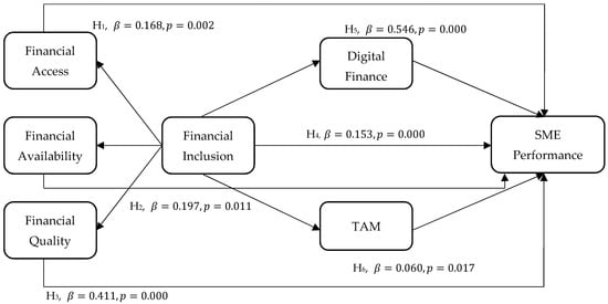 The results of H5 (β = 0.441, t = 9.831, p =0.000) and H6 (β = 0.102, t = 2.324, p = 0.021) present digital financing and TAM as mediators of the relationship between financial inclusion and SME performances.
