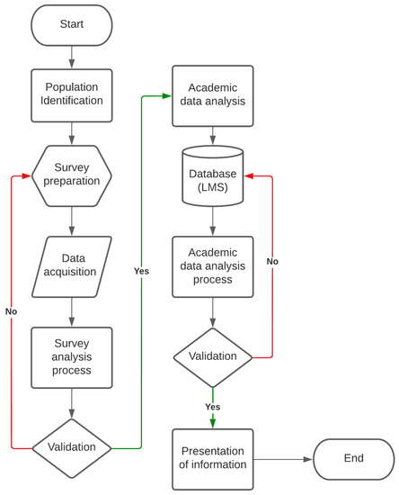 The acquisition of data depends on the tools used for the survey. In several studies this collection is done by physical means, which includes there being a digitization process [25]. In this work, the survey was carried out using technological resources and an online tool, for example, Google Forms or the institution’s own tools. Surveys could be included in the learning management system (LMS), which improves data collection and allows surveys to be targeted to target groups.