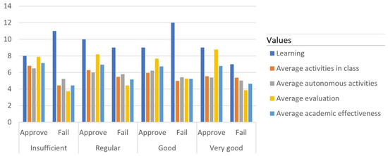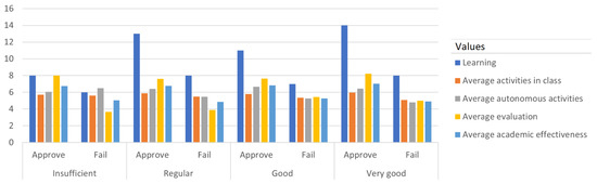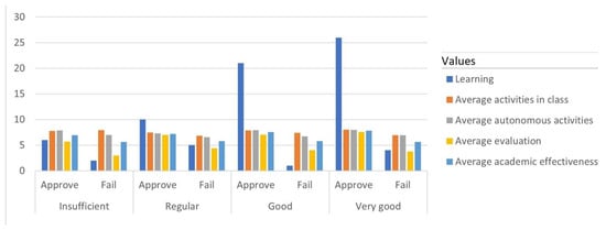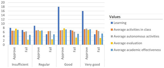 As mentioned in previous sections, the evaluation period corresponded to the first partial. This condition is important because, even when the results obtained appear in the condition of passing or failing, this is not necessarily maintained until the end, since the average of the second part has not been evaluated. Therefore, it was found that 46 students passed the midterm by obtaining an effective average grade equal to or greater than 6/10. An unexpected result was that the grades were the factor that determined the approval of a partial and later the approval of a subject. However, this did not imply that the student necessarily learnt a subject. As shown by the results, where, of the 14 students who had reflected insufficient learning, eight passed the midterm with an average grade of 6.7 and only 6 students failed the midterm. All categories had students who passed and failed, with the total number of failed students being 29. When reviewing the very good learning status, it was found that 8 students failed even though their learning level was the highest. The total average of the group in its effectiveness was 6.1, a value that, according to previous analyses and the experience of the academic quality departments, is a normal value in partial 1 in a residential model.